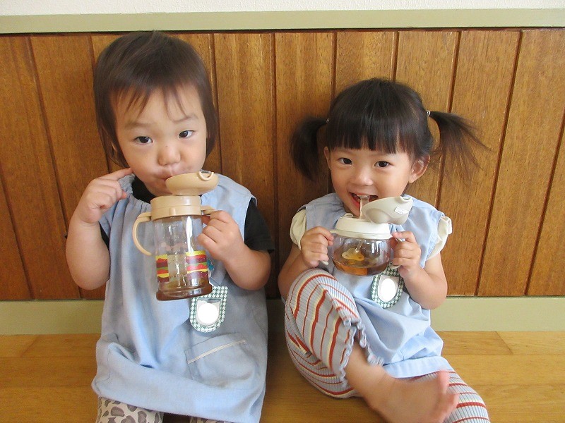 右: 上手にお茶をのめるよ!